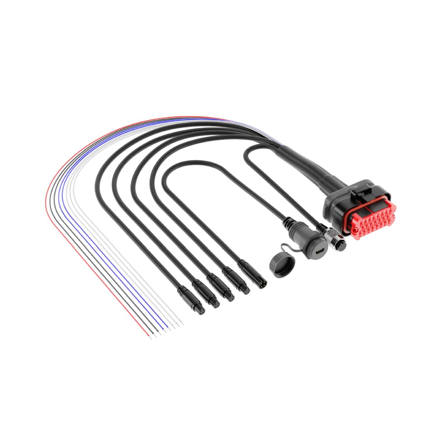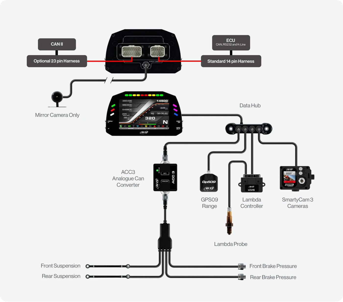 Use the main harness and connect to the correct wires for your communication bus (CAN, RS232 or K-Line) by physically wiring the correct wires from your harness to the ECU's data ports and power/ground pins. Then, configure the connection in Race Studio 3 by selecting your ECU manufacturer and model under the "ECU Stream" tab.